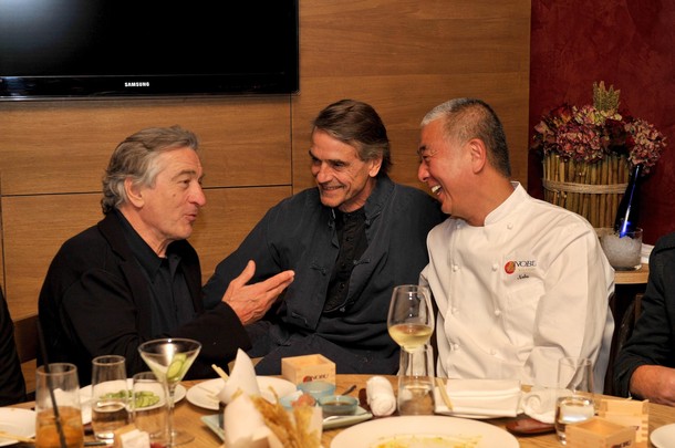 U.S. actor Robert De Niro (L) talks with British actor Jeremy Irons (C) and Japanese chef Nobu Matsuhisa during the official opening of Nobu restaurant in Budapest, October 10, 2010. Picture taken October 10. REUTERS/Nobu/Handout (HUNGARY – Tags: SOCIETY ENTERTAINMENT) THIS IMAGE HAS BEEN SUPPLIED BY A THIRD PARTY. IT IS DISTRIBUTED EXACTLY AS RECEIVED BY REUTERS, AS A SERVICE TO CLIENTS. FOR EDITORIAL USE ONLY. NOT FOR SALE FOR MARKETING OR ADVERTISING CAMPAIGNS