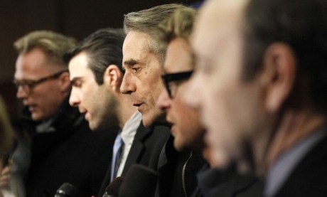 Cast members (from L-R) Paul Bettany, Zachary Quinto, Jeremy Irons, Simon Baker and Kevin Spacey are interviewed at the premiere of “Margin Call” during the Sundance Film Festival in Park City, Utah January 25, 2011. REUTERS/Mario Anzuoni (UNITED STATES – Tags: ENTERTAINMENT)
