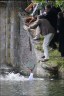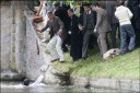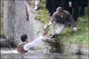 He has just enough time to hand his precious books to Hardy, before he bobs under the water. Dev was spotted spitting out some of the river water which he had swallowed during the stunt.