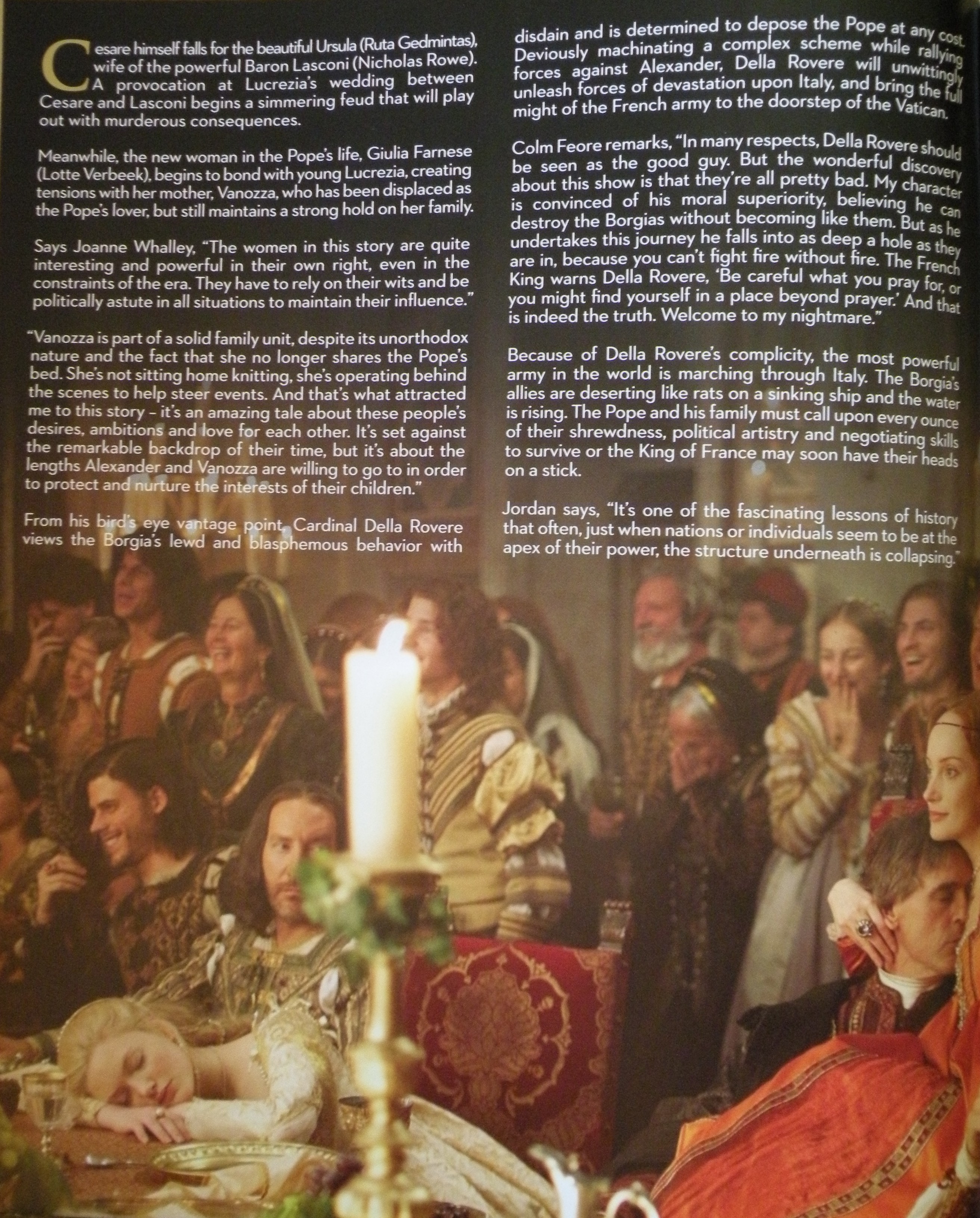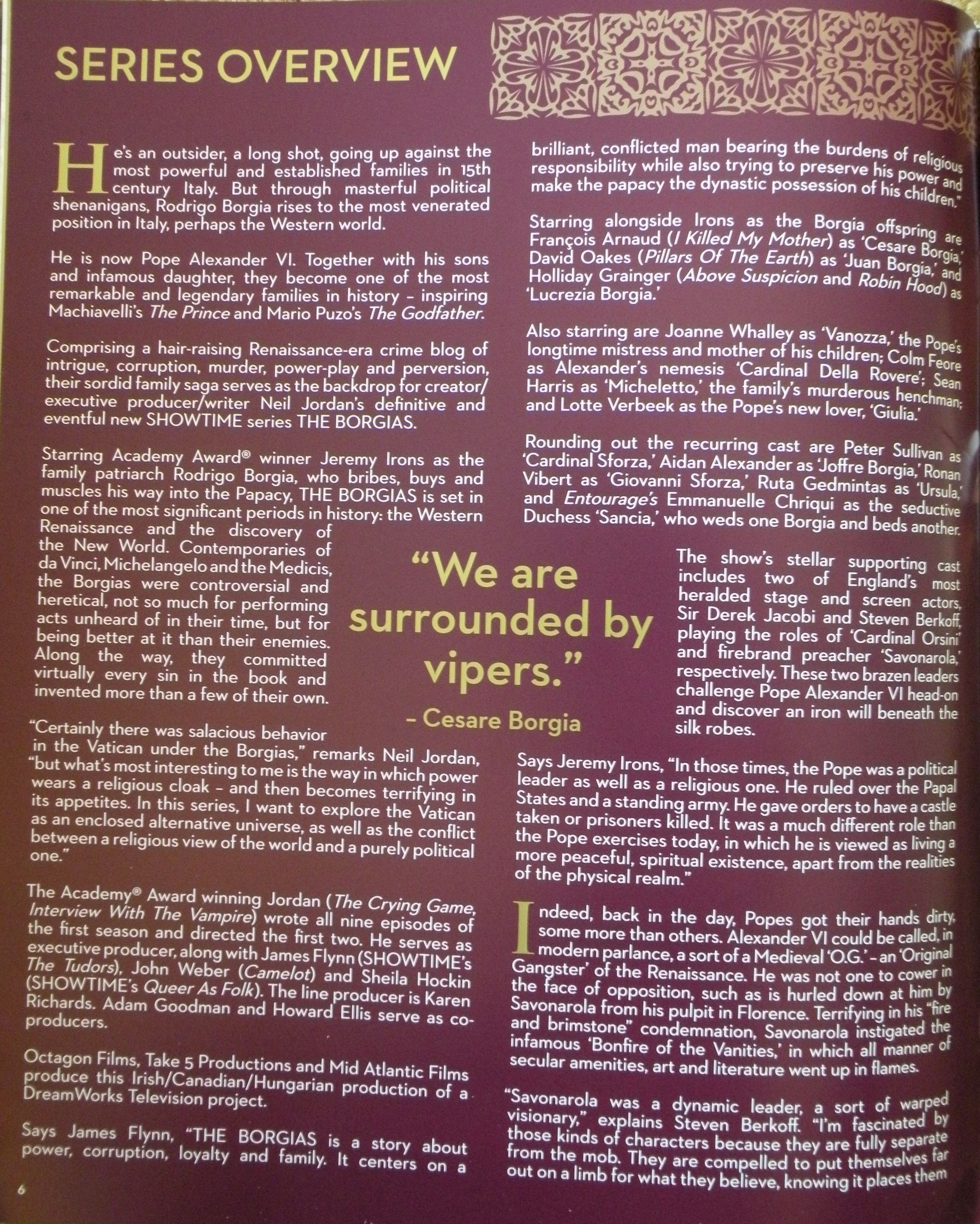 The series was originally envisioned as going for four seasons, matching the run of predecessor The Tudors. But while filming a pivotal scene in the Season 3 finale, Jordan said Irons turned to him and told him that “this feels like the end of something, that the family has come to an end.” While mulling a potential fourth season, Jordan said he wasn’t sure he had enough material for 10 episodes and wasn’t sure whether Showtime would want to commit to another season either. ”As a compromise, I proposed to finish the arc of all the characters with a two-hour movie,” Jordan said, adding that Showtime commissioned the script and he wrote it. “When they looked at what it could cost, it was just too expensive,” he said. “Sadly, that’s what happened. I would have loved to bring all the characters to a conclusion. All of the actors were heartbroken we couldn’t continue, and so was I.” Jordan said he still likes where the story currently ends with the third season finale, especially for siblings Cesare and Lucrezia, and thanked Showtime for supporting his vision.Doing a standalone movie to wrap the big-budget Borgias would’ve been hard to pull off not only from a production but also from a marketing and promotion standpoint. “Ultimately the show was designed as a regular series, and I was reluctant to do an extra two-hour disconnected from the whole that could be potentially anti-climactic,” Showtime Entertainment president David Nevins said. “Now we have a nice upward build towards the finale. We have a nice ending, a good climax, and I didn’t want to muck it up with an afterthought.”