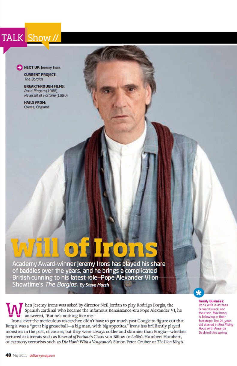 If there’s a cad or a creep to be played, Jeremy Irons’s antennae shoot up. “Characters who live on the outer edge of acceptable behavior have always been to my taste,” says the Oscar winner, now starring as the power-mad patriarch of Showtime’s series The Borgias (Sundays, 10 p.m. ET/PT). Irons, 62, chats with Steve Daly about his affinity for sinners.