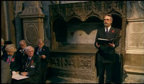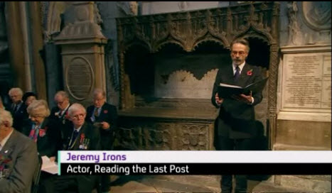 Actor Jeremy Irons will read Last Post by the Poet Laureate, Carol Ann Duffy, during the service to recognise military and civilian contributions to the conflict.